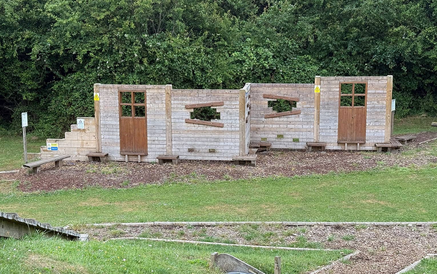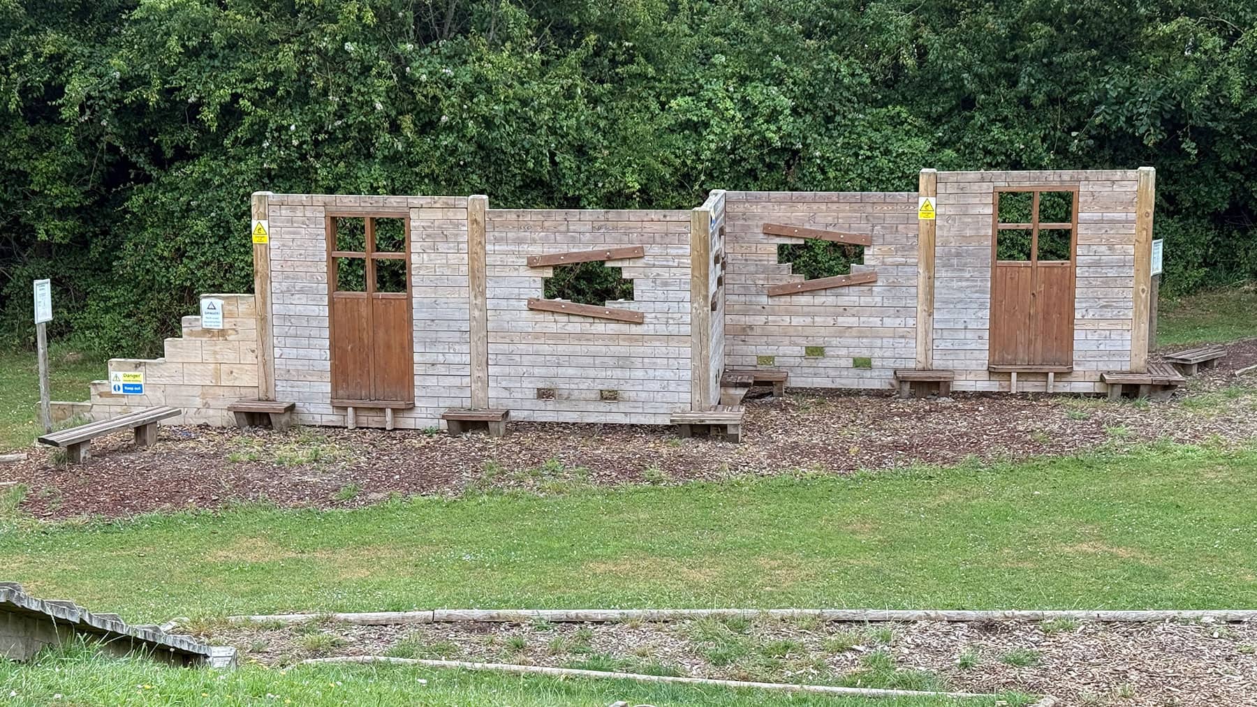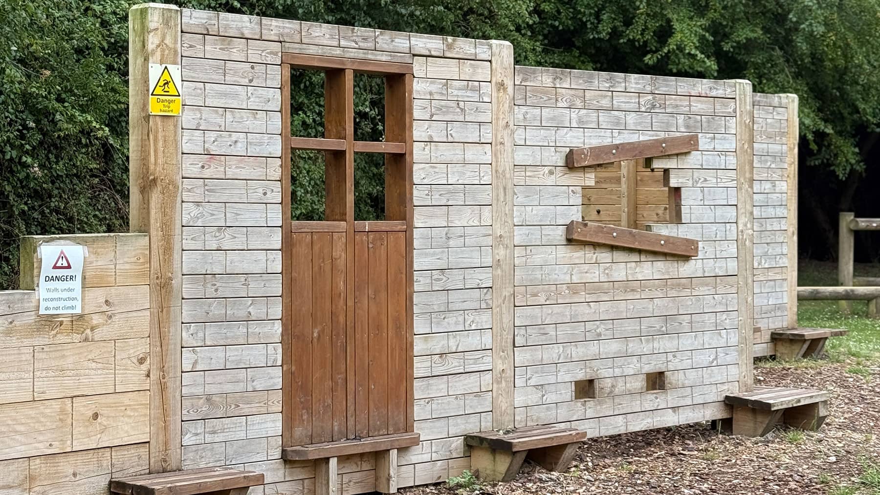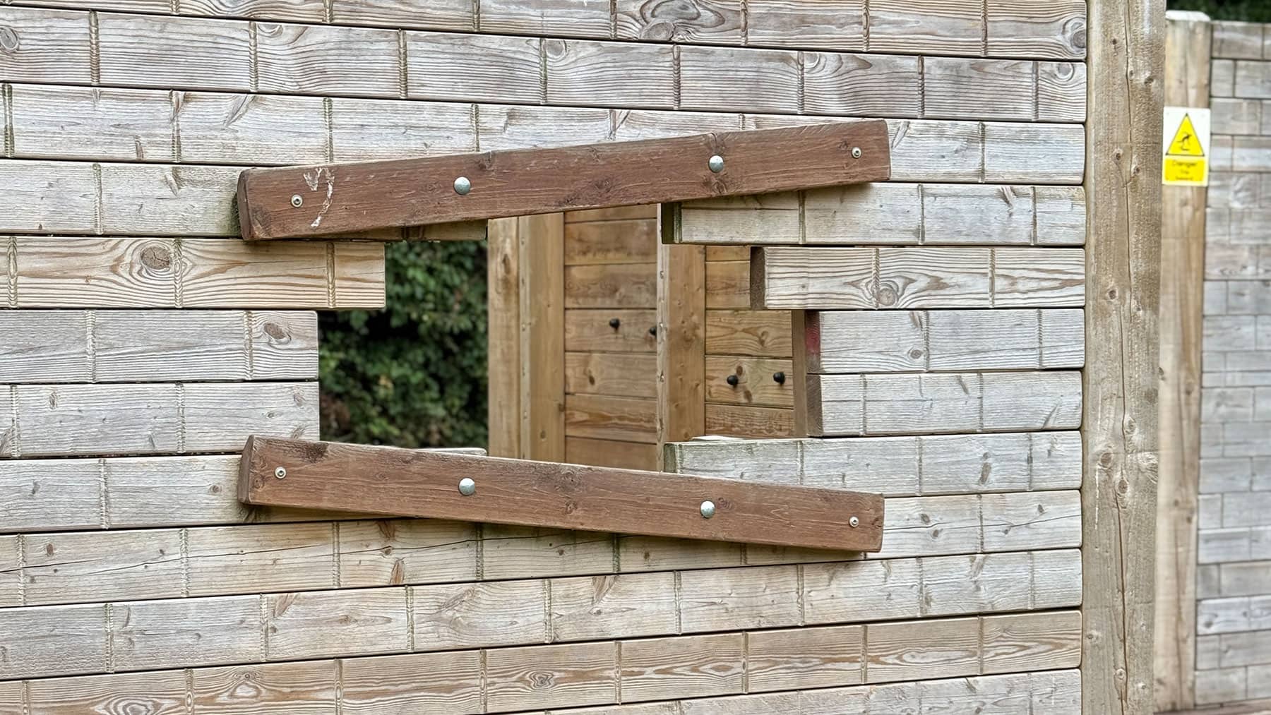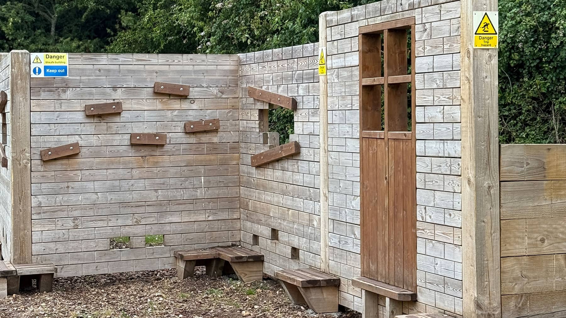 Our team was commissioned by a local study centre to upgrade an outdoor play area. The client requested the removal of existing equipment and the installation of a bespoke traverse wall designed to fit an “earthquake” theme, creating an engaging and imaginative climbing feature for children. The objective was to deliver a creative, safe, and visually striking piece of play equipment that encouraged climbing, problem-solving, and imaginative play. Swipe for more The new traverse wall was designed and constructed as a bespoke timber feature with intricate detailing to reflect the earthquake theme. Key aspects of the works included Bespoke timber traverse wall: A timber traverse wall was custom-built to suit the site and theme, incorporating climbing features appropriate for the age group and abilities of the children Engraved “collapsed brickwork” design: The timbers were engraved to resemble collapsed brickwork, complete with doorways, windows, and protruding bricks to create a realistic and immersive effect Integrated climbing features: Strategically placed holds and protrusions were incorporated into the design to encourage climbing, balance, and coordination Themed play experience: The feature was designed to tie into the wider “earthquake” theme of the study centre, providing an engaging and imaginative outdoor play experience Several challenges were carefully managed to ensure the project met both safety and design requirements Removal of existing equipment: The existing units were safely removed and cleared from the site, ensuring minimal disruption to the study centre’s operations Design and fabrication: Creating a realistic earthquake effect in timber required detailed planning and craftsmanship, which was achieved through bespoke engraving and precision assembly Safety considerations: All climbing features were installed to meet relevant safety standards, with careful attention to fall zones, heights, and impact surfaces The completed traverse wall provides a unique and visually striking play feature that encourages physical activity, imaginative play, and problem-solving. The client was delighted with the finished piece, particularly the attention to detail in the “collapsed brickwork” design and the way the feature tied seamlessly into the earthquake theme. The bespoke traverse wall has transformed the area into an engaging and memorable outdoor space for children. Bespoke Traverse Wall Installation at Local Study Centre